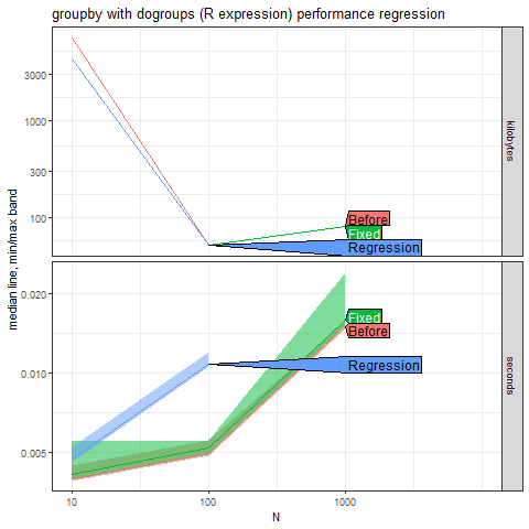 data.table:::`[.data.table`(d, , (max(v1)-min(v2)), by = id3)This setup and expression is then passed to atime_versions, along with a bit of package management information, and hashes (a.k.a. “Commit ID” or “SHA”) for the commits before, during, and after the performance regression.